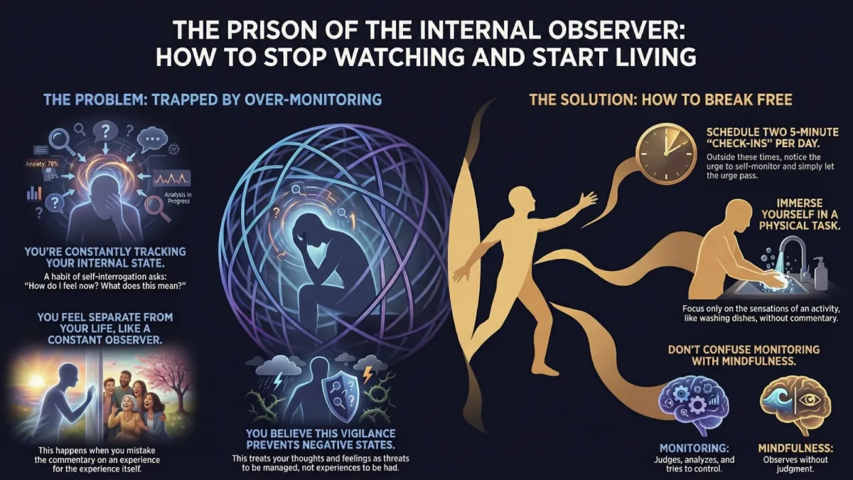 Confusing this over-monitoring with mindfulness. Mindfulness observes without entanglement; monitoring judges and manages.