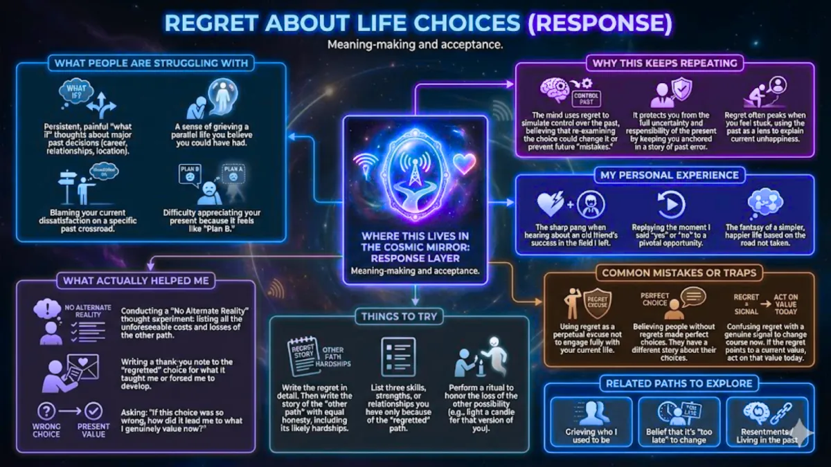 Persistent, painful "what if" thoughts about major past decisions (career, relationships, location).