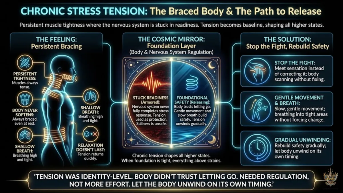 The body is held in a sustained state of readiness for threat that never arrives.