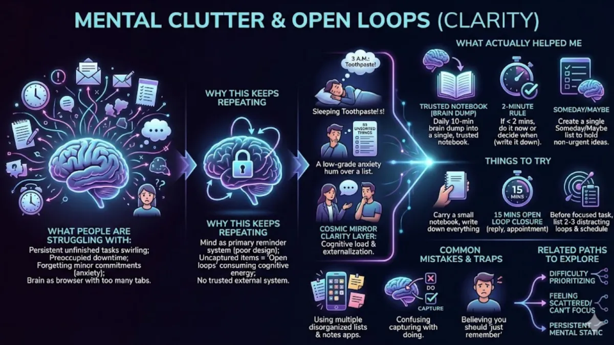 Every uncaptured thought, task, or idea creates an "open loop" that consumes background cognitive energy.