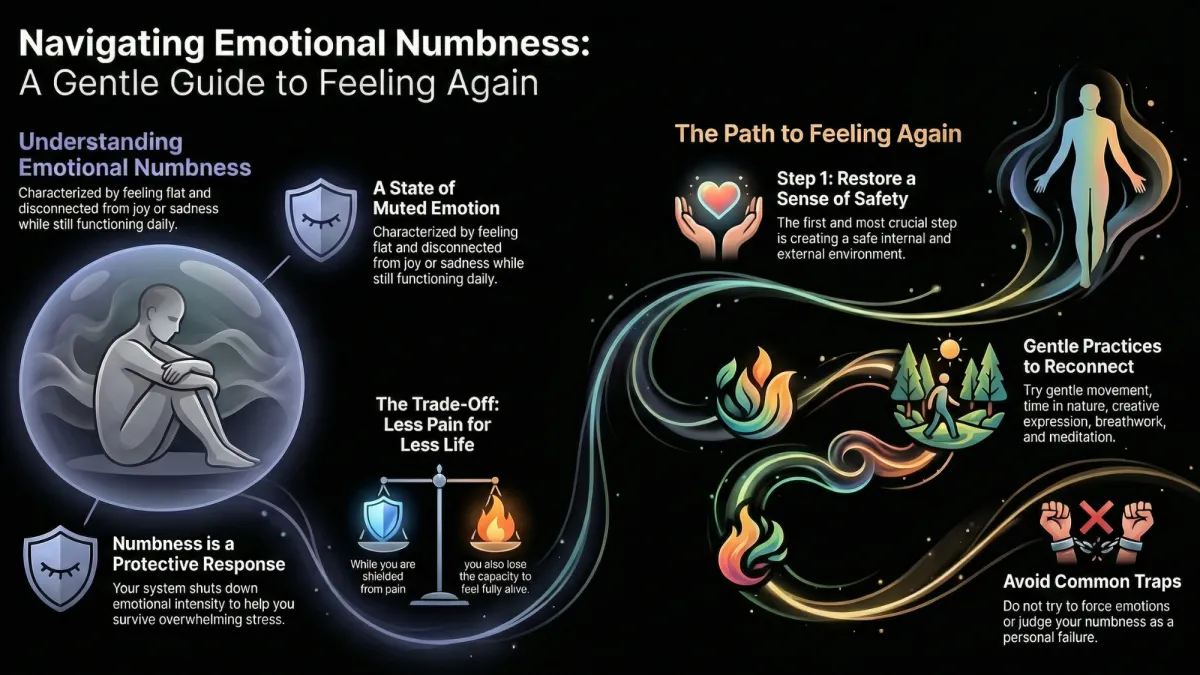 This keeps repeating because numbness is protective. The system shuts down intensity to survive. When stress or emotional load stays high for too long, the nervous system reduces sensitivity as a way to prevent overload. You don’t feel the pain as sharply, but you also don’t feel much else. It’s not a failure. It’s a containment strategy. The problem is that the system doesn’t automatically turn sensitivity back on just because the threat is gone. Flatness can persist long after the original stress has passed.