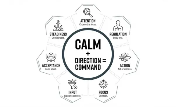 This diagram is not a belief system. It is an operating code. It shows how I stay steady under pressure. Calm comes first. Direction comes next. Together, they create command. The outer elements are not ideas to think about. They are actions to execute when things get loud or uncertain. Attention is chosen. The body is regulated before the mind is trusted. Action replaces rumination. Focus is narrowed. Inputs are controlled. Facts are accepted without emotional collapse. Steadiness is maintained. Nothing here is about feeling better. It is about staying functional, clear, and effective when it matters.