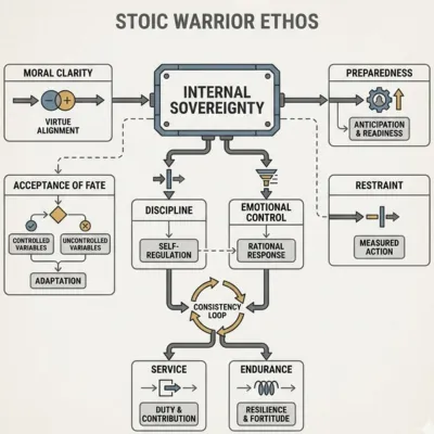 The Stoic warrior maintains inner order under external chaos, acts according to principle under pressure, accepts fate without surrender, and remains useful regardless of outcome.
