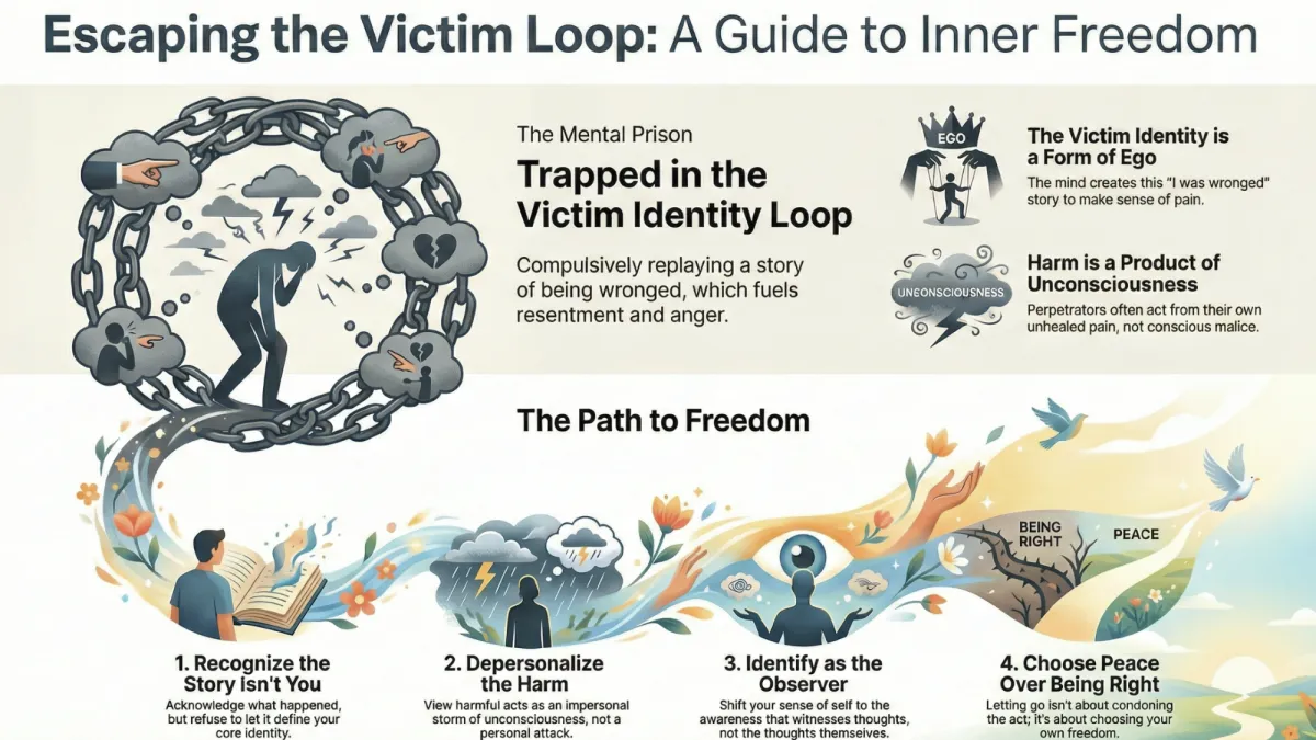 This is the hard but crucial truth I had to face: the victim identity, even when completely justified by real events, is a form of ego. It is a conceptual identity the mind creates to make sense of pain. The more I replayed the story, the more I cemented that identity: "I am the one who was wronged." It became my sense of self.